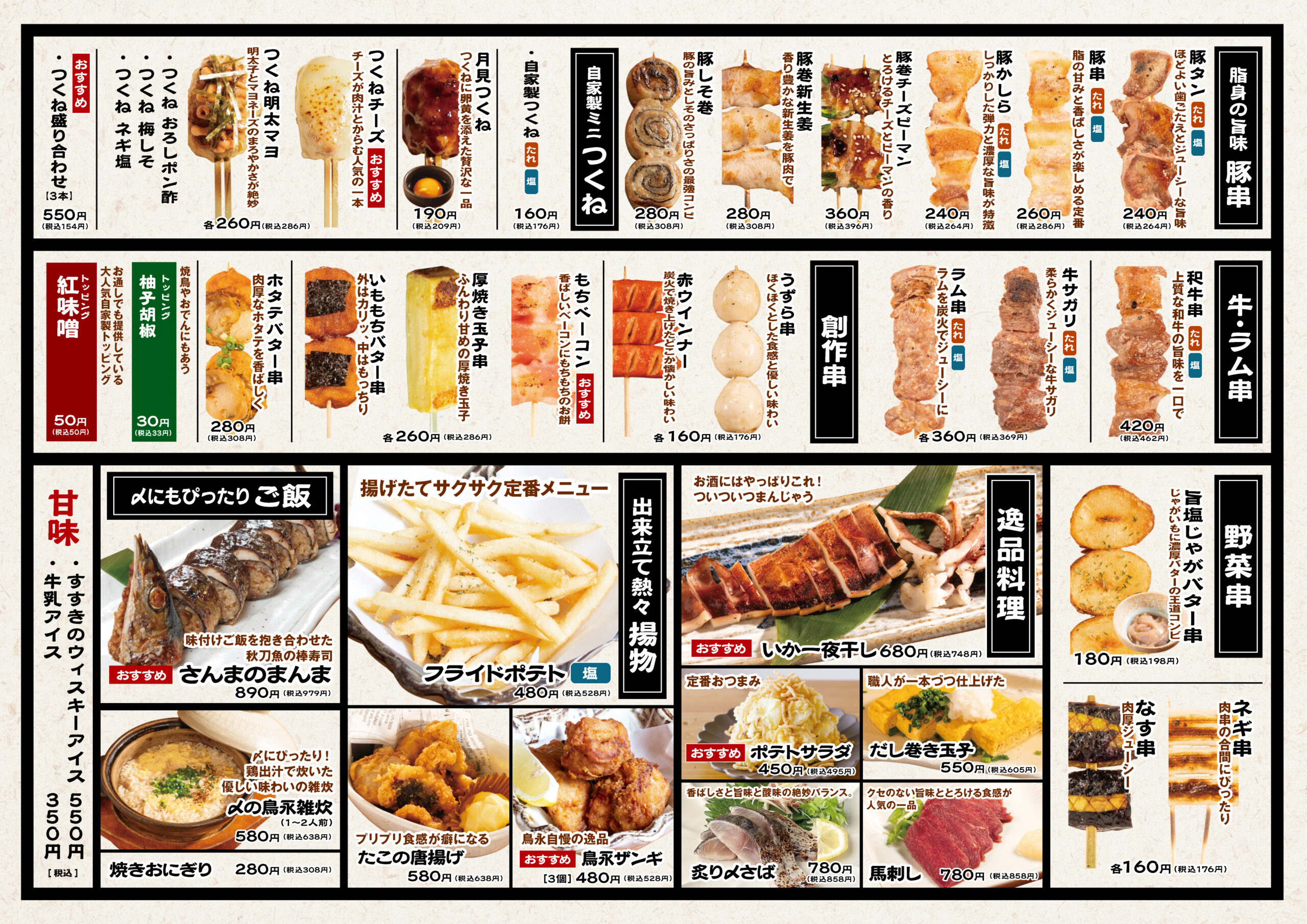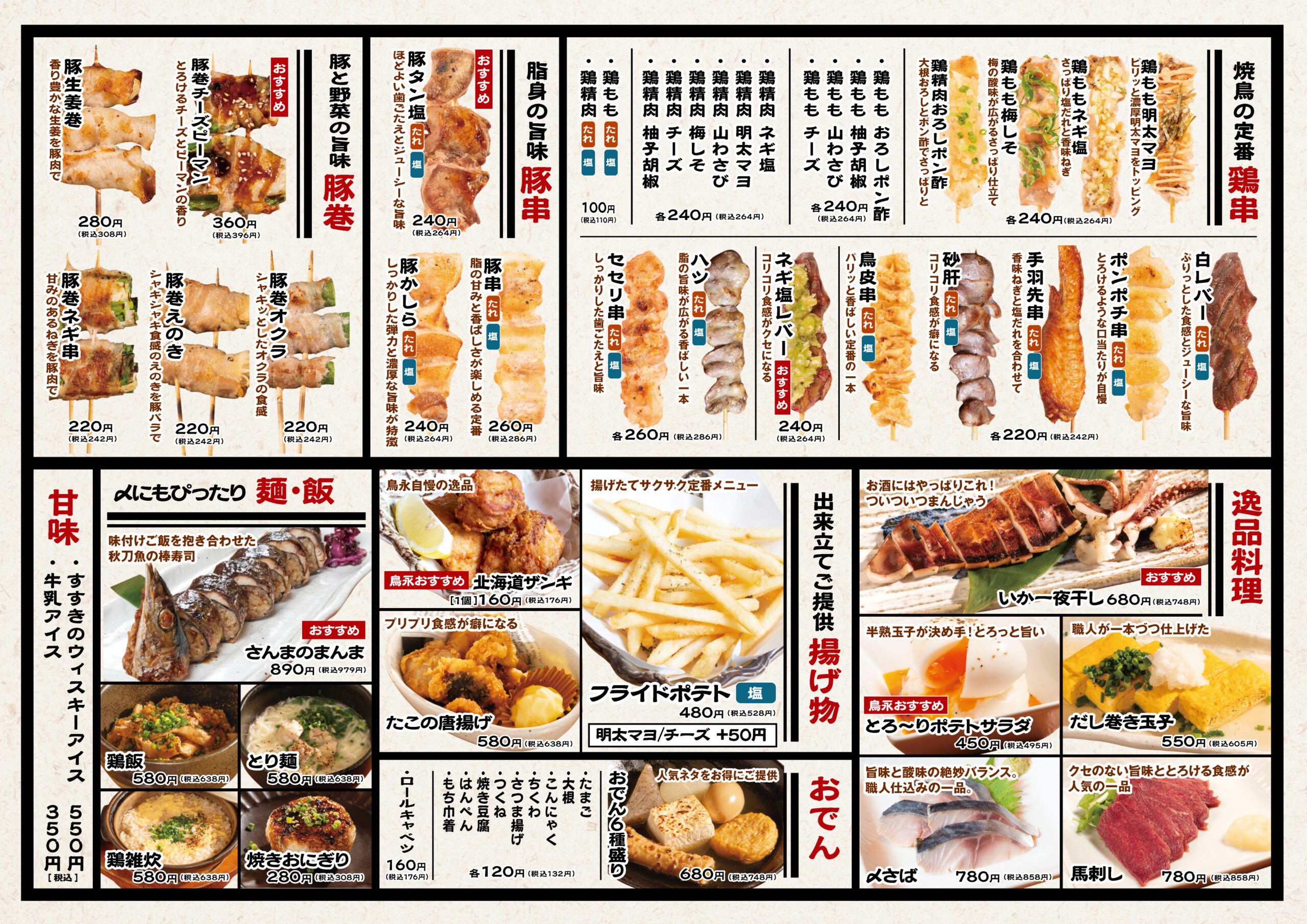 焼鳥100円(税込110円)をキャッチフレーズに、安くて美味しいお料理をご提供致します!